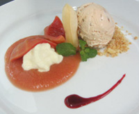 (Mousse de Queijo coroado com Goiaba ao Porto sobre Purê de Goiaba e Sorvete de Côco Queimado)