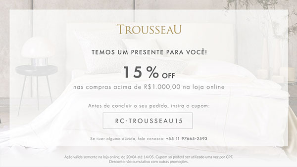 Até 14/05, use o cupom RC-TROUSSEAU15 e ganhe 15%OFF no site da Trousseau nas compras acima de R$1000 para garantir o presente perfeito da sua mãe!