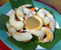 Camarões empanados na tapioca com molho de laranja, gengibre e pimenta dedo de moça