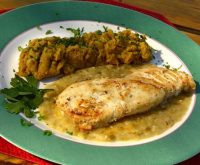 Curuípe – filé de badejo grelhado ao molho de biribiri com purê de banana da terra